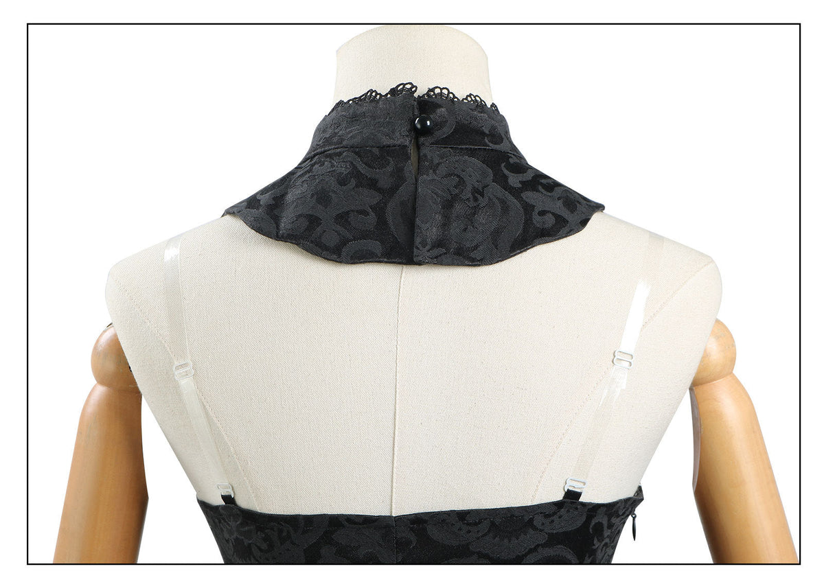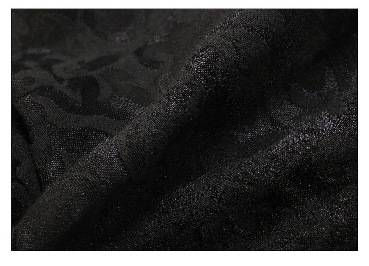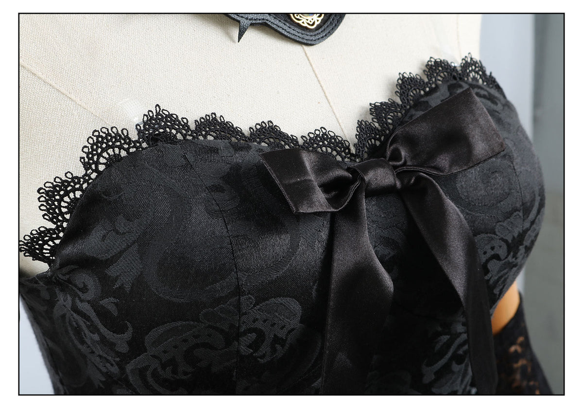 Fabric: Black jacquard / Black glass yarn / Thick black yarn / Black satin / Black lining / Black leather / Black lace / Fabric lining